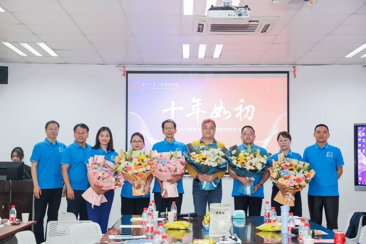 本次返校主题为“十年如初”。据悉,EMBA六班校友是在2012年的12月22日入学的,全班同学把班级精神定为“在一起”,在校学习阶段和毕业后举办了丰富多彩的活动很好地融汇和践行了这一宗旨。2022年是EMBA六班入学十周年,班级较早地成立了十周年筹备组,开展了动员和策划各项前期活动。但由于新冠疫情原因不得已延迟到了2023年。本次聚会全班有45名同学返校参加座谈会,占全班同学的70%。虽然毕业良久,校友们依旧激情澎湃,饱含感情。校友们为老师准备了鲜花表示敬意,回顾了在EMBA的学习初心和满满收获,分享了有笑有泪有爱有感动的十年同窗情。座谈会上,大家齐声合唱建班之初创作的歌曲《西大欢迎你》,共同观看了同学们电子相册“EMBA六班十年风采录”和同学们亲自出演的MV《曾经的你》,现场气氛热烈,掌声不断。最后,大家共同期待和拥抱下一个十年。