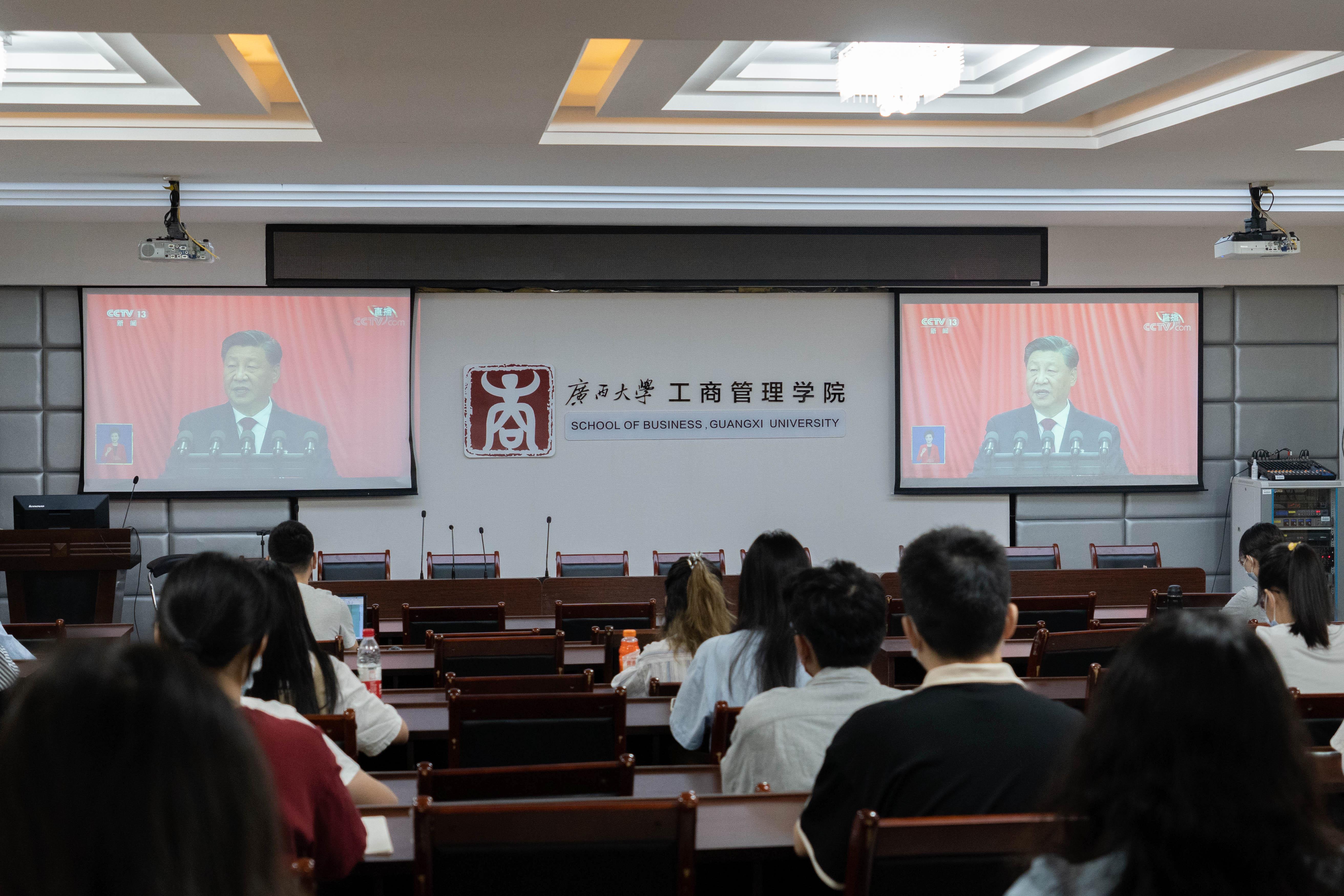 必赢官网学生代表在124教室集中收看党的二十大开幕会