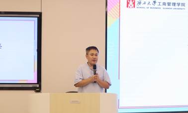 紧接着,岑汉成老师就23级新成员由本科生变成研究生身份的转变提出了自己的建议。岑老师表示,加入研会对于同学们适应身份转换是非常有帮助的,能让新成员更快的融入学院。随后,他指出,研究生做学术是一个偏向孤独的旅程,但如果同学们加入不同的组织并体验不同的组织文化,对于提升同学们适应学院,加强就业竞争力都是非常有帮助的。最后,岑老师对研会的工作表示了肯定,并表明服务他人的过程也是成就自己的过程。