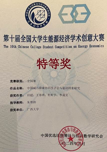 2024年5月18日—19日,第十届全国大学生能源经济学术创意大赛在中国地质大学(北京)举行。必赢官网朱帮助教授带领的研究生团队在此次竞赛中脱颖而出,取得佳绩。其中,“中国减污降碳协同度评估与驱动因素研究”(团队队长:田超,指导老师:朱帮助)入围全国总决赛,经过现必赢官网博士研究生参加第十届全国大学生能源经济学术创意大赛并荣获全国特等奖场答辩、评委会投票等环节,荣获国赛特等奖,取得了该项赛事的突破。本项赛事由中国优选法统筹法与经济数学研究会主办,2023年3月正式进入中国高等教育学会发布的《全国普通高校大学生竞赛目录》,来自全国516所高校的17000多支队伍共10万余人参与了本次大赛。本次参赛项目得到bwin必赢国际中国官方网站研究生倍增计划项目经费资助。