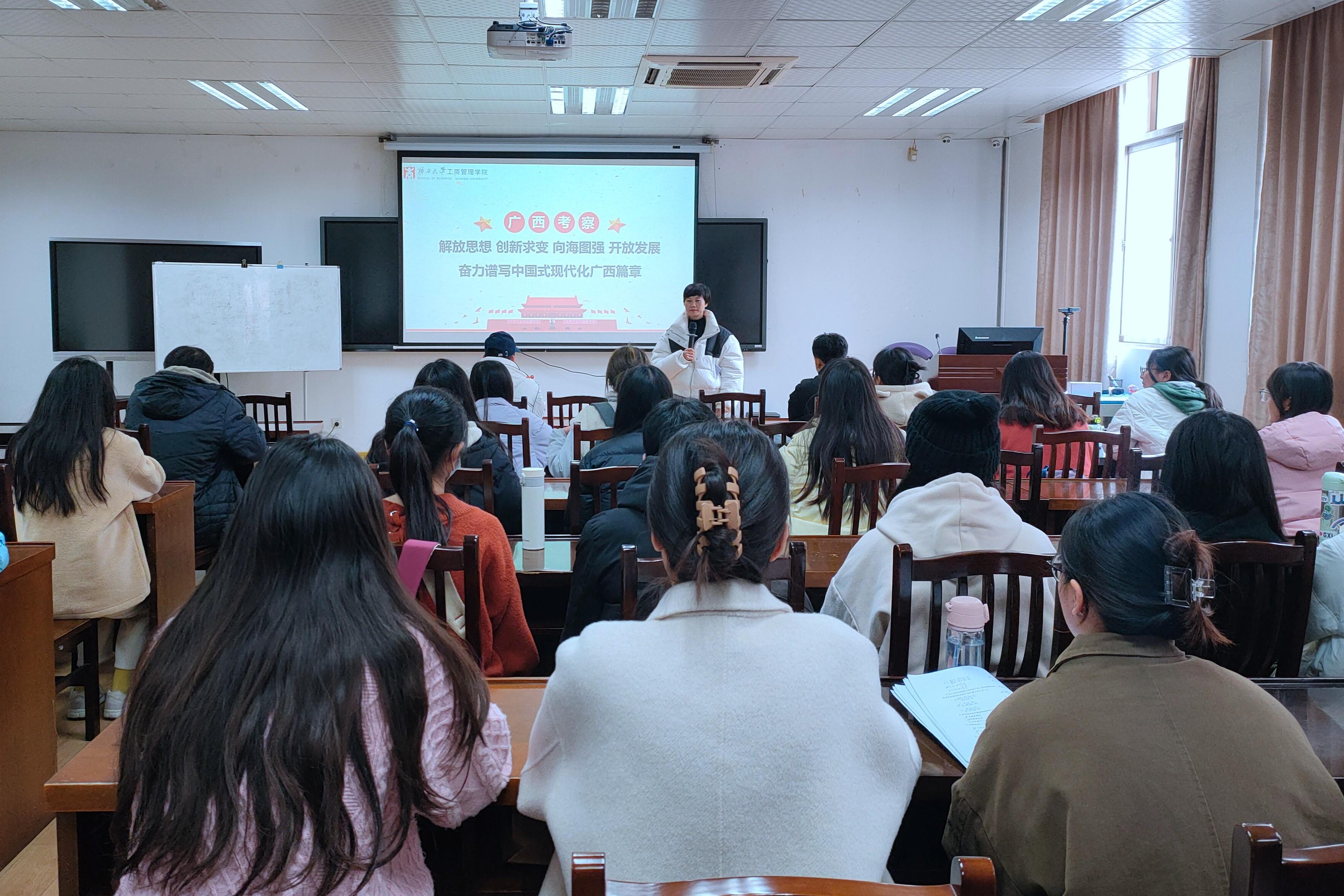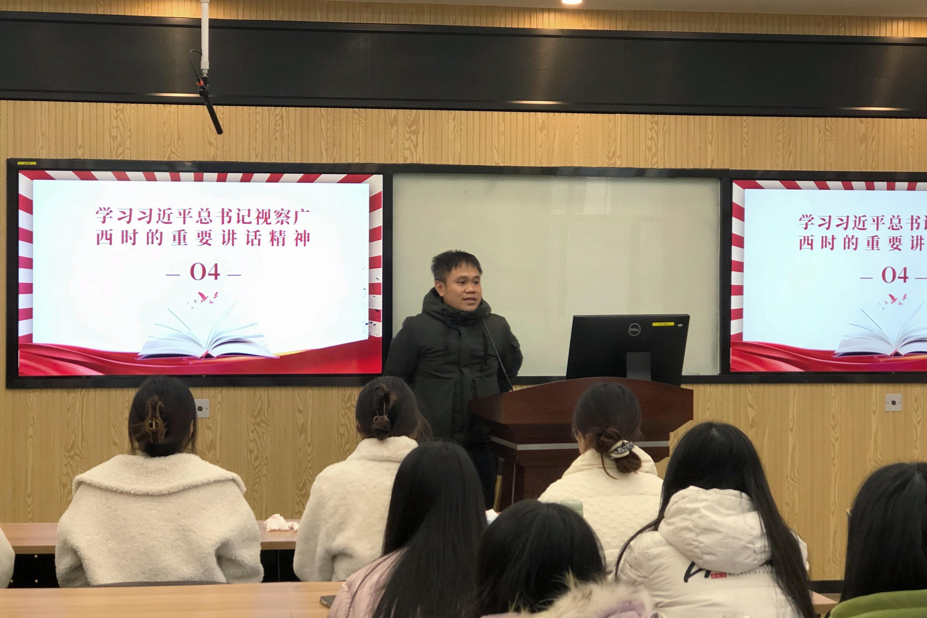 学院团委书记马丽娟希望同学们认真学习习近平总书记视察广西时的重要讲话精神,并通过青年大学习、学习强国等渠道,加强政治理论学习,紧跟党的步伐,听党话,跟党走,自觉将政治理论学习转化为指导自身专业学习和未来就业方向的思想武器,把个人的理想追求融入党和国家事业之中,勤于实践,勤于思考,扎根广西、建设广西、服务广西,为建设壮美广西贡献青春力量。