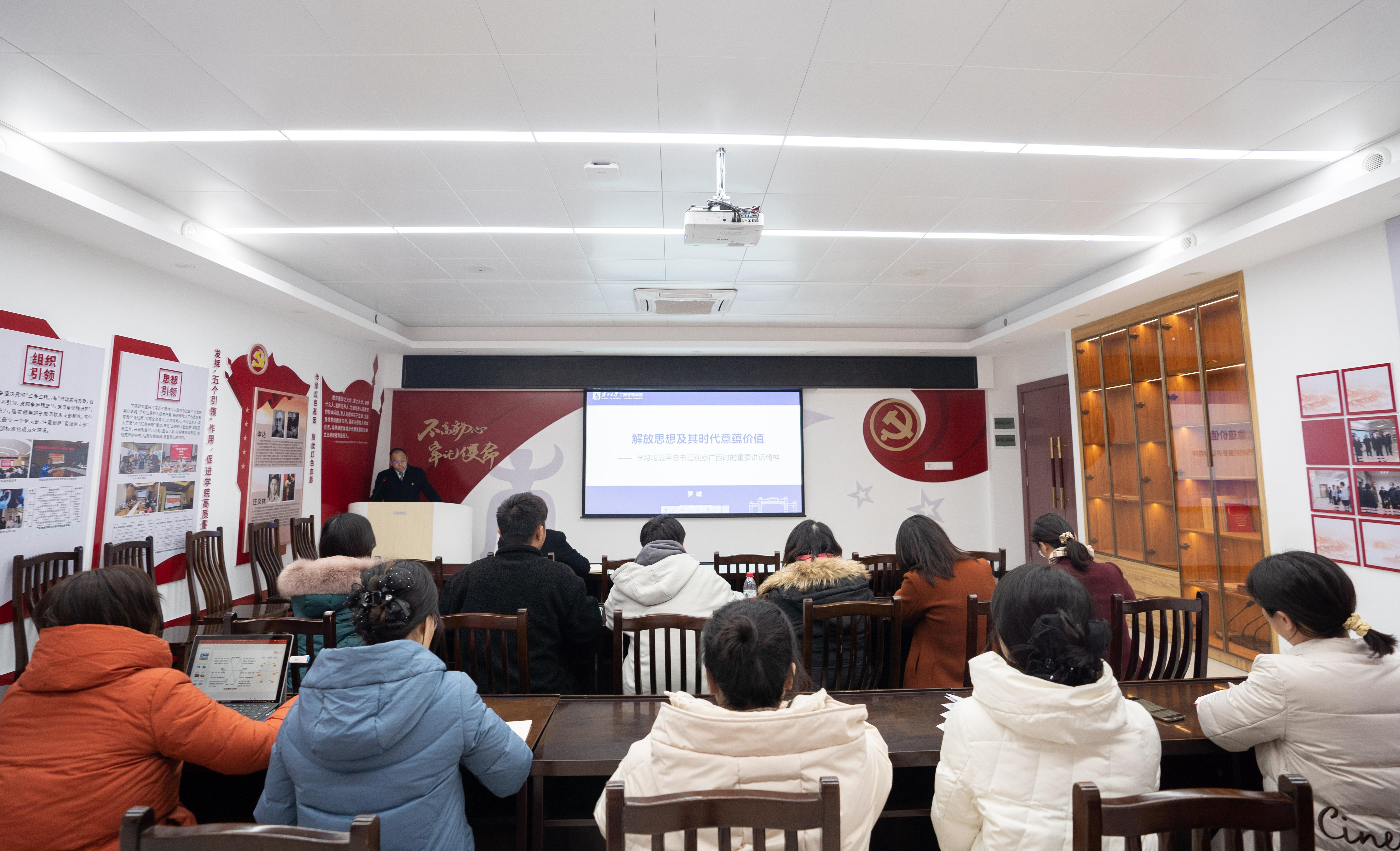 12月19日下午,教工行政党支部在学院党员活动室集中学习习近平总书记视察广西的重要讲话精神。学院党委书记罗诚以《解放思想及其时代意蕴价值》为题,带领教工行政党支部全体党员学习习近平总书记视察广西的重要讲话精神。