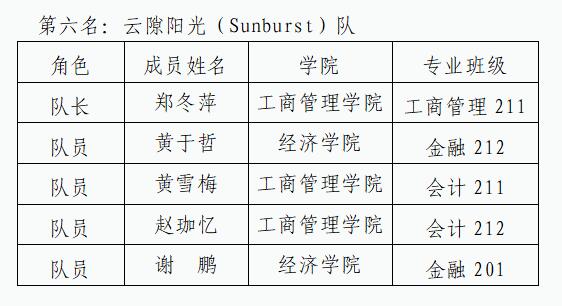 我校共有34支队伍参加,经过初赛、复赛、半决赛的重重筛选,有16支队伍进入复赛,8支队伍进入半决赛,3支队伍获得总决赛资格。按照每所院校最多2支队伍进入总决赛的规则,我校选派“光宗耀祖”队与“云隙阳光”队参赛。两支队伍由范伟、陈伟宏、唐秋鸿、施冬冬、劳可夫等老师指导,参赛队员来自bwin必赢国际中国官方网站和经济学院。比赛中,同学们顽强拼搏、沉着应战,表现出良好的专业能力,也充分展现了我校在此项赛事的实力与风采。