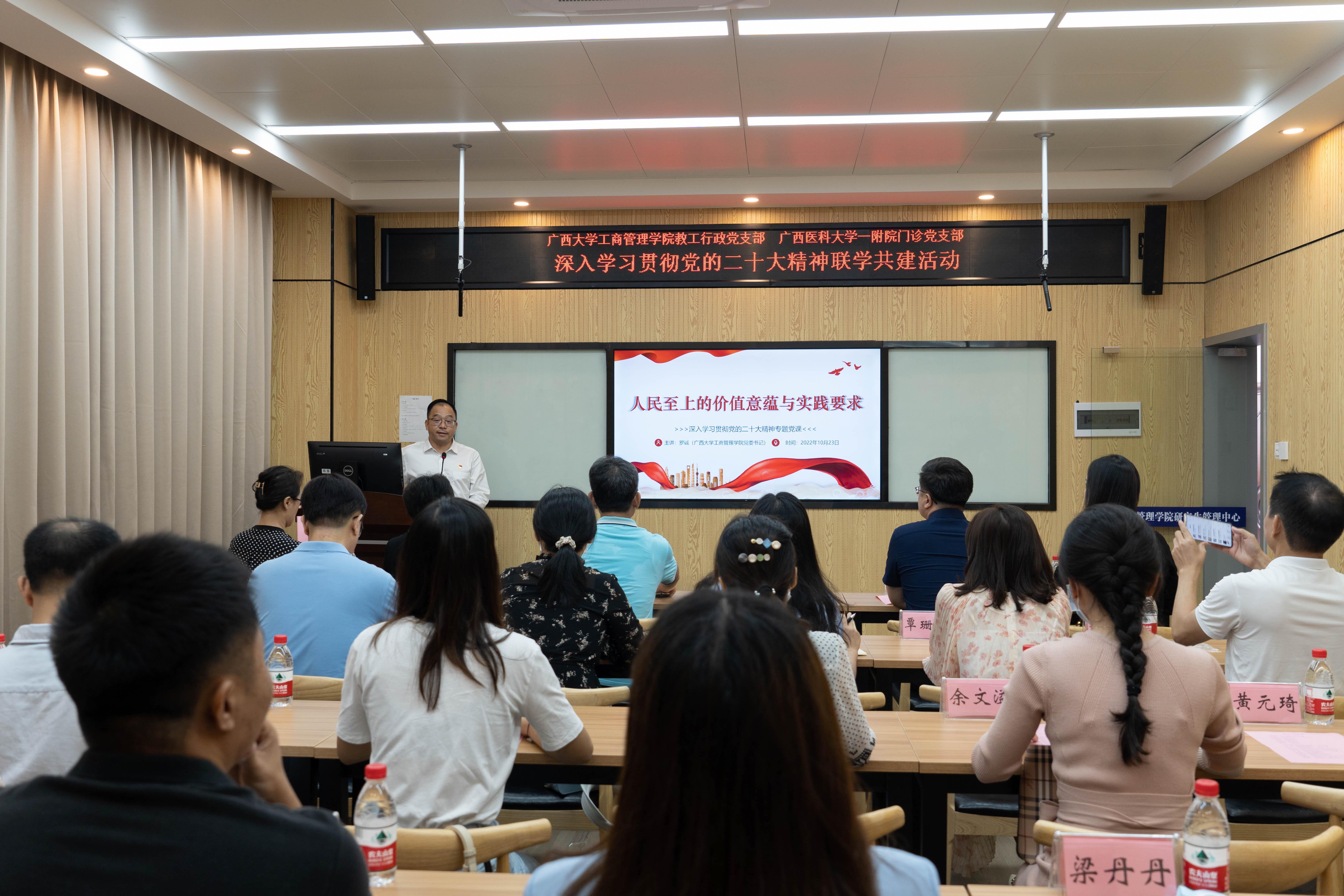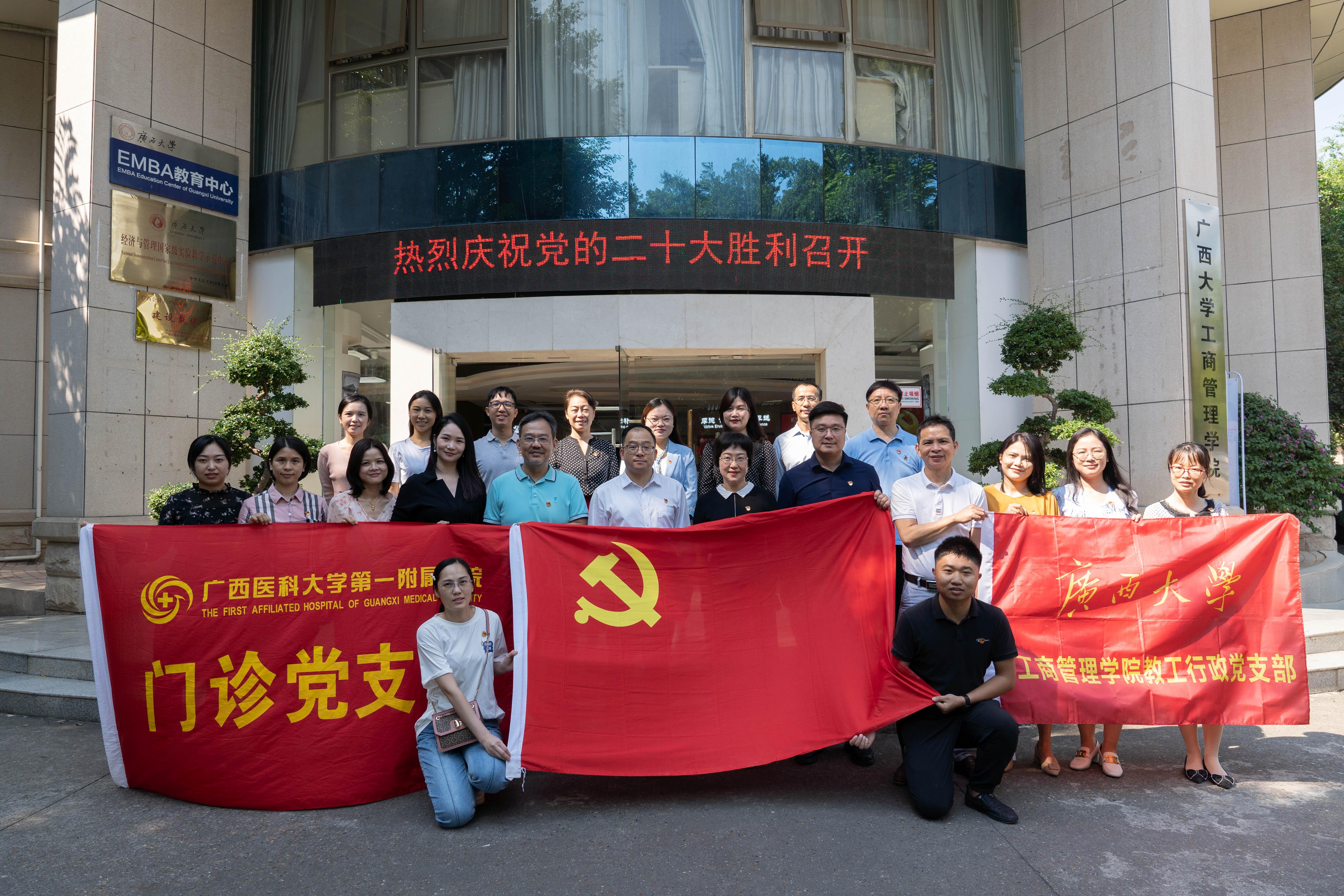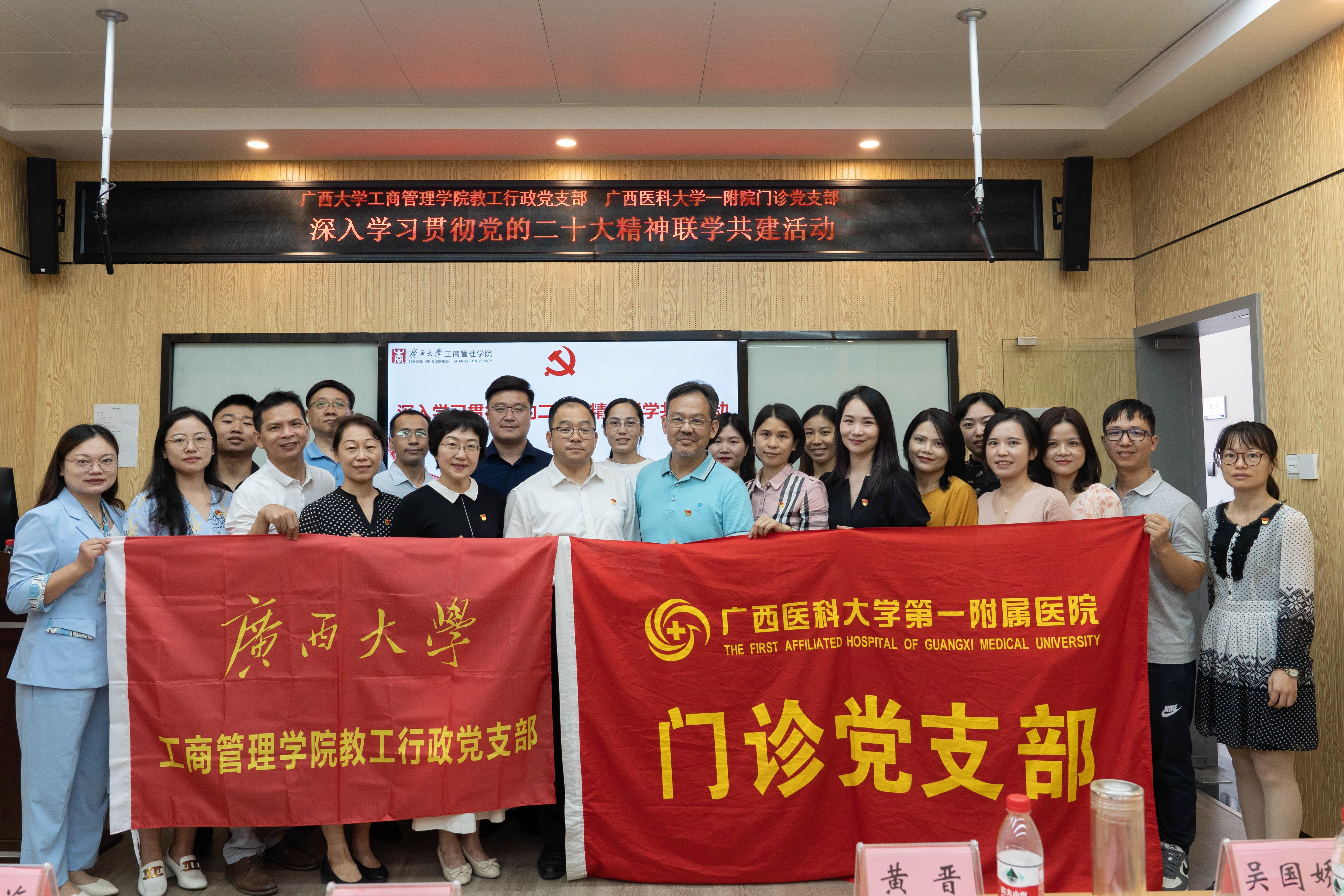 在党的二十大胜利闭幕之际,为深入学习贯彻党的二十大精神,持续推进基层党建工作内容创新、方法创新,不断加强党的建设,10月23日上午,bwin必赢国际中国官方网站教工行政党支部与广西医科大学一附院门诊党支部联合开展深入学习贯彻党的二十大精神联学共建主题党日活动。学院党委书记罗诚以普通党员身份参加了本次活动。