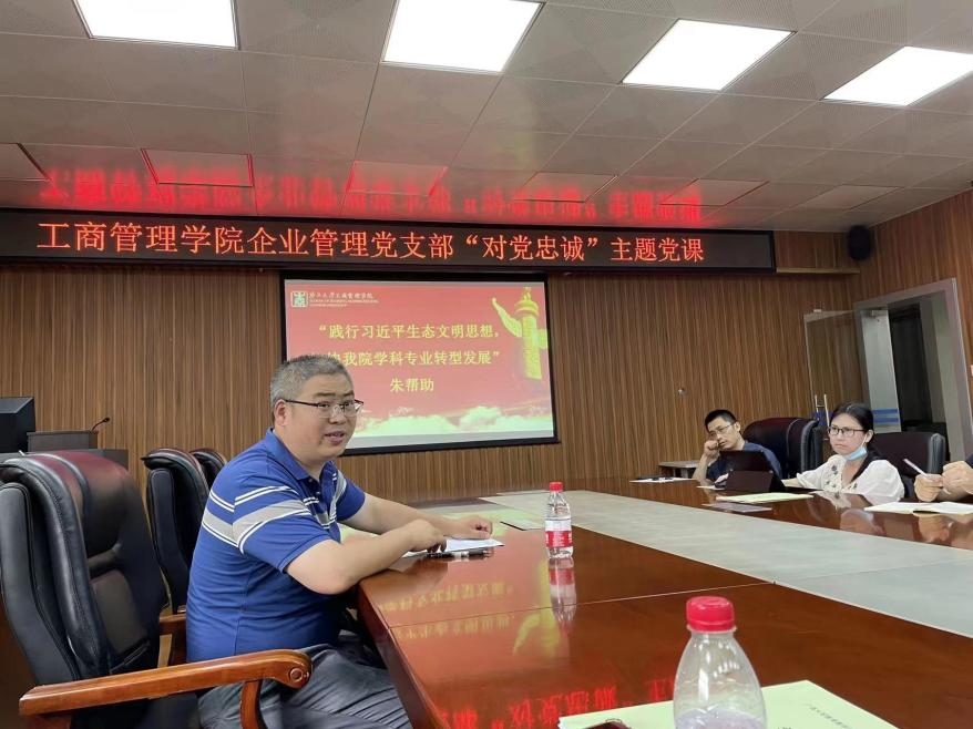 6月21日,院党委副书记、院长朱帮助为教工企管系党支部讲授“对党忠诚”专题党课,他要求教工党员立足本职工作,对党忠诚,始终保持对党的崇高理想和使命的自觉自醒,始终坚守正确的政治立场和政治追求,始终保持为党和人民事业奋斗的初心初衷和应有定力。朱帮助院长强调,目前学院处于学科建设、专业转型的爬坡阶段,学院的发展离不开全体教职工的共同努力,教师党员要在其中起到表率作用,认真落实学校、学院党委的工作部署,注重师德师风建设,践行习近平生态文明思想,加快学院的转型发展,向“双一流”建设目标迈进。