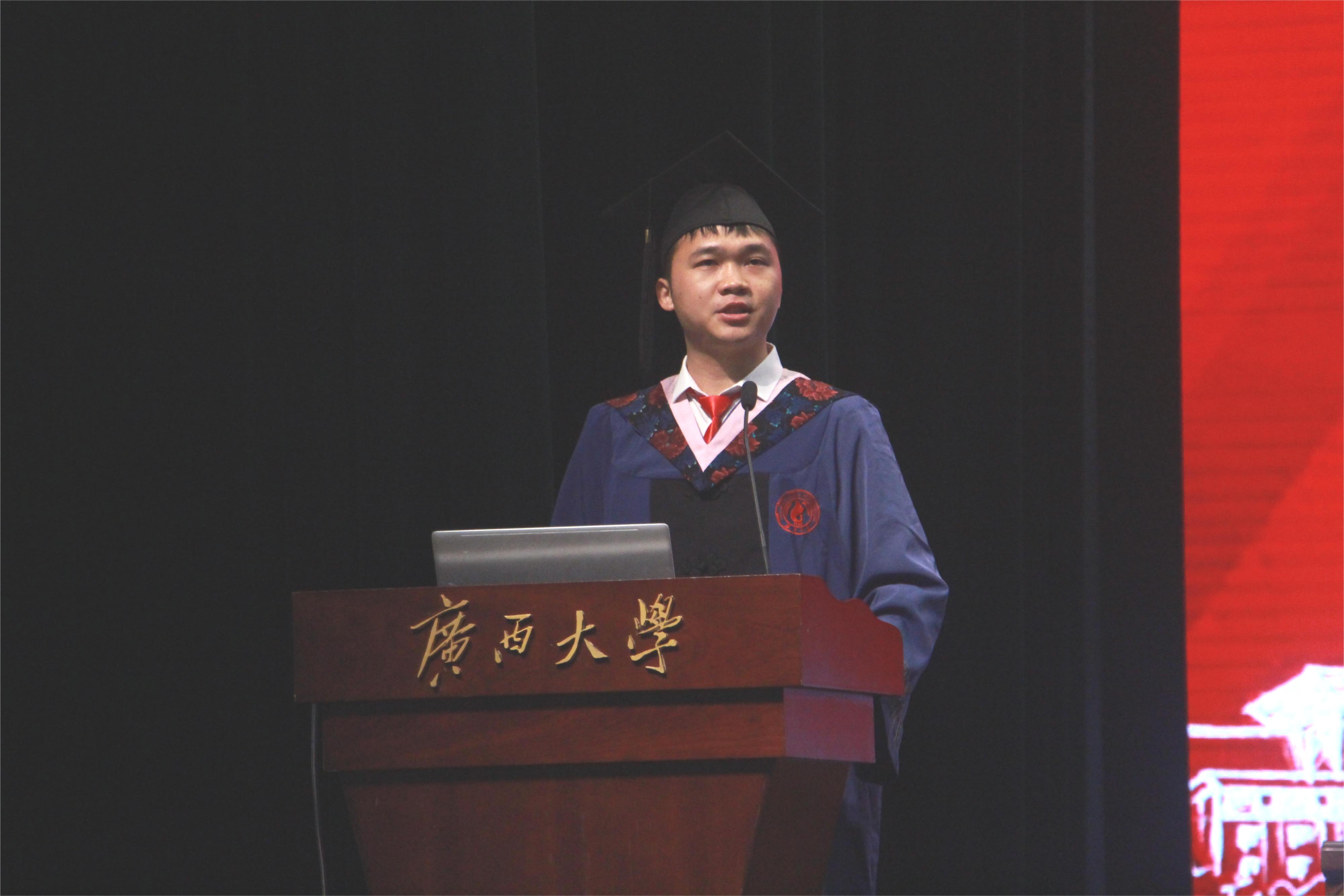 本科毕业生代表王璐与大家一同回忆大学四年的青葱岁月,对身边的同学、老师表达了感谢,自己取得的成绩及获得的荣誉离不开学校与学院给予的机会,离不开老师和同学们的帮助。她表示,大学四年的结束并不意味着学习生涯的结束,毕业生们应牢记勤恳朴诚、厚学致新的校训,厚德博学、创新卓越的院训,用青春书写无愧时代,无愧历史的篇章。