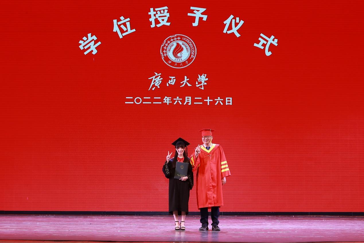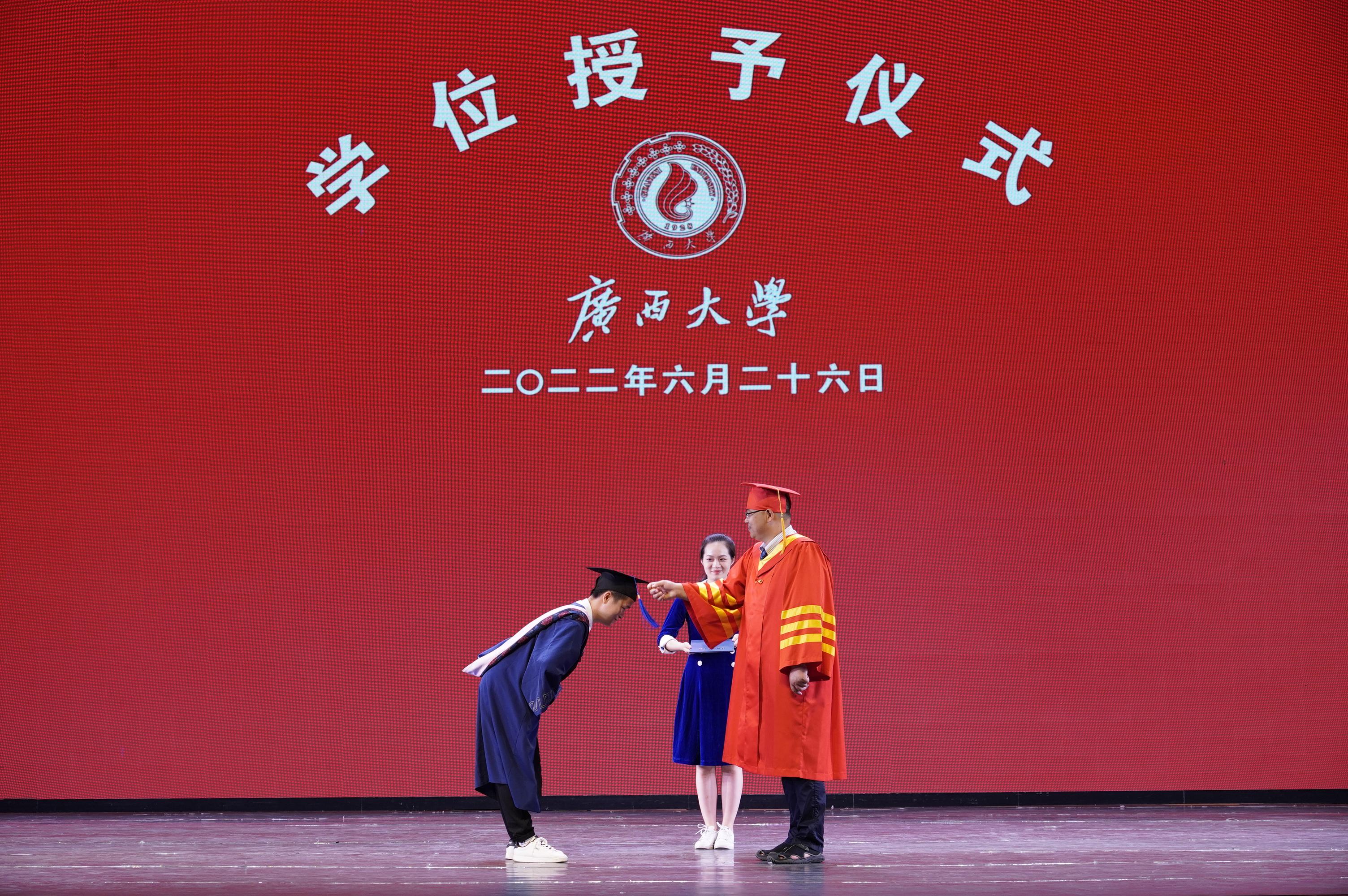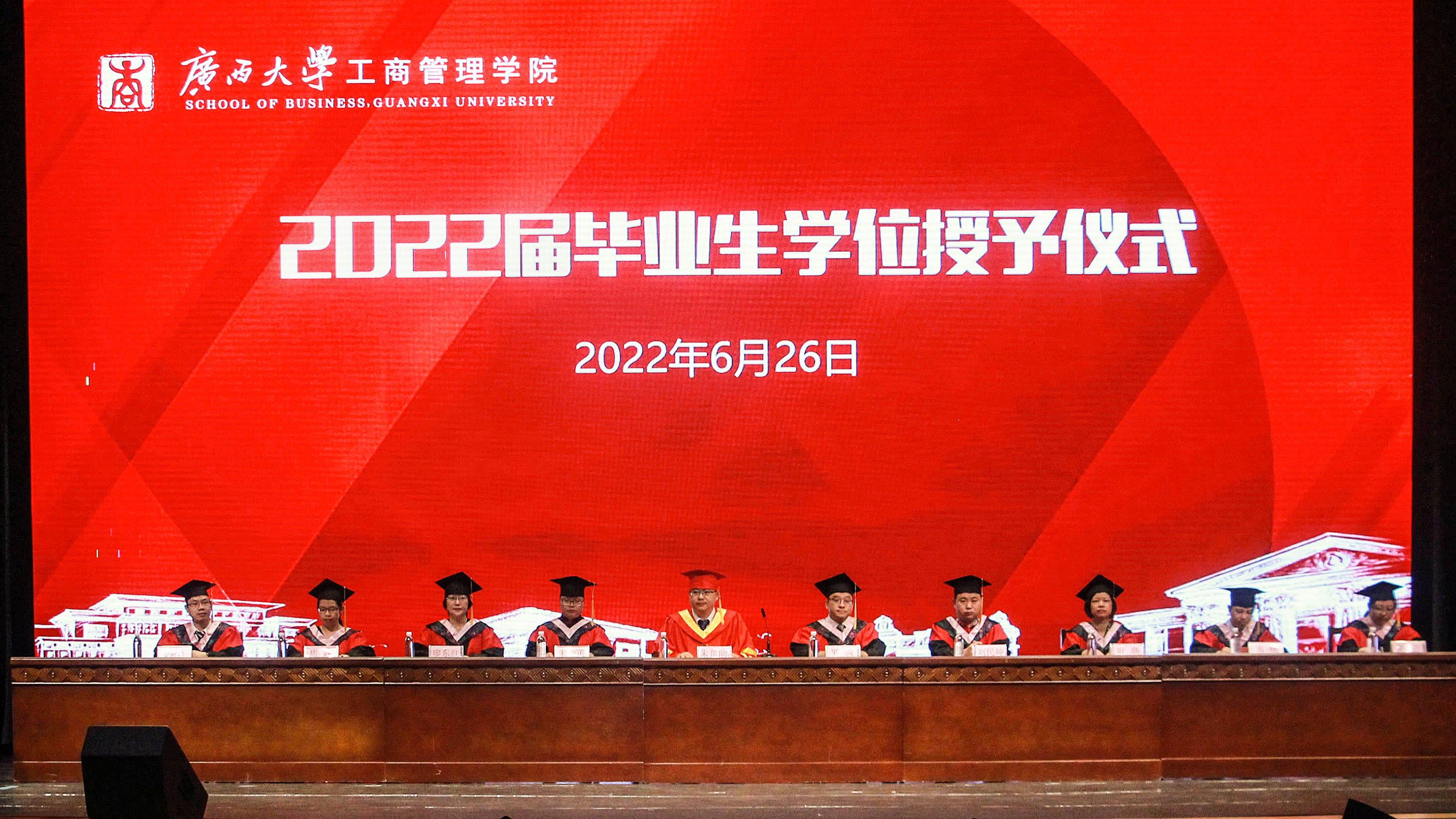 2022年6月26日,bwin必赢国际中国官方网站在学校大礼堂为2022届755人毕业生(其中研究生485人,本科生270人)举行庄严而隆重的毕业典礼暨学位授予仪式。院党委书记罗诚,院长朱帮助,院党委副书记黄晋,副院长朱少英、刘民坤、廖东红,教师代表叶映、韦铁、郭峦、唐妤、梁世昌出席仪式。仪式由院党委副书记黄晋主持。