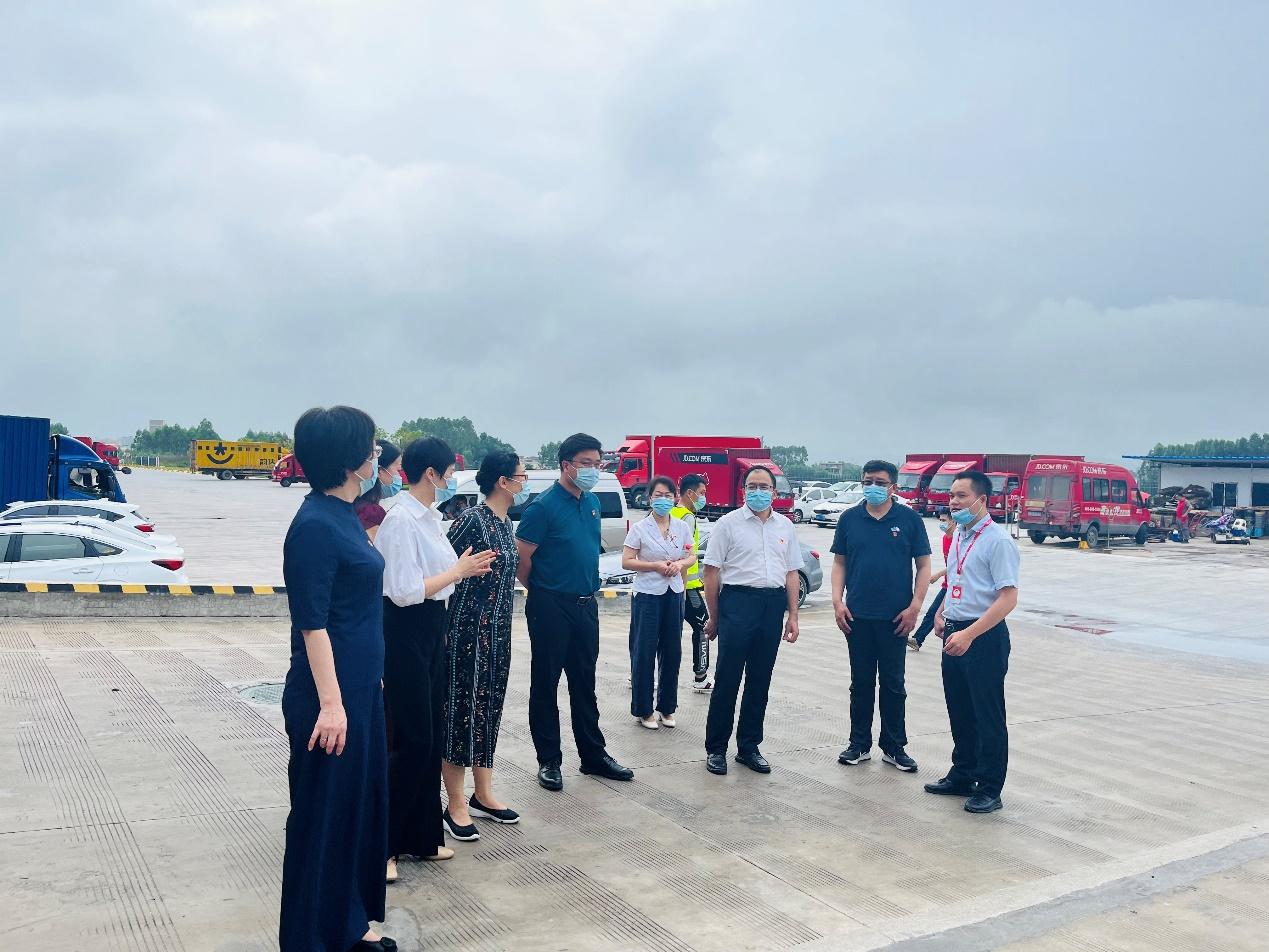 党委书记罗诚(左五)带队走访调研南宁京东“亚洲一号”智能产业园,京东集团区域公共事务总监、京东信成党支部书记张霓(左四)等热情接待