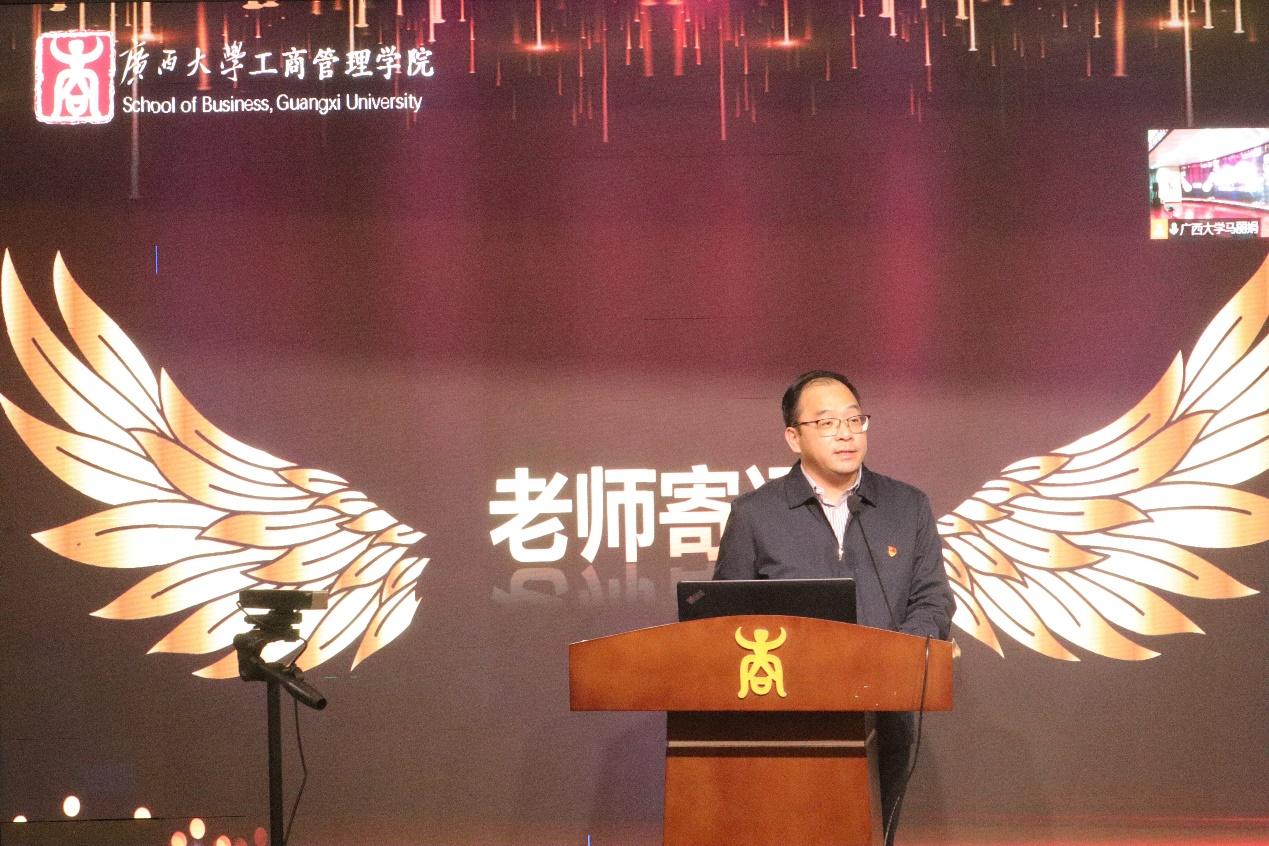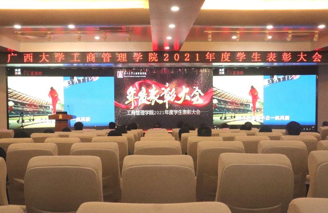 4月19日下午,bwin必赢国际中国官方网站2021年度学生表彰大会在128报告厅隆重举行。本次大会采用“线上直播+线下表彰”的全新方式,学院党委书记罗诚出席大会并致辞,学院党委副书记黄晋,研究生管理中心、组织员办、教学办等部门负责人,学工组全体老师和上海高顿教育培训有限公司广西分校的嘉宾代表以及学生代表共43人参加线下会议,1200余名师生线上观看。