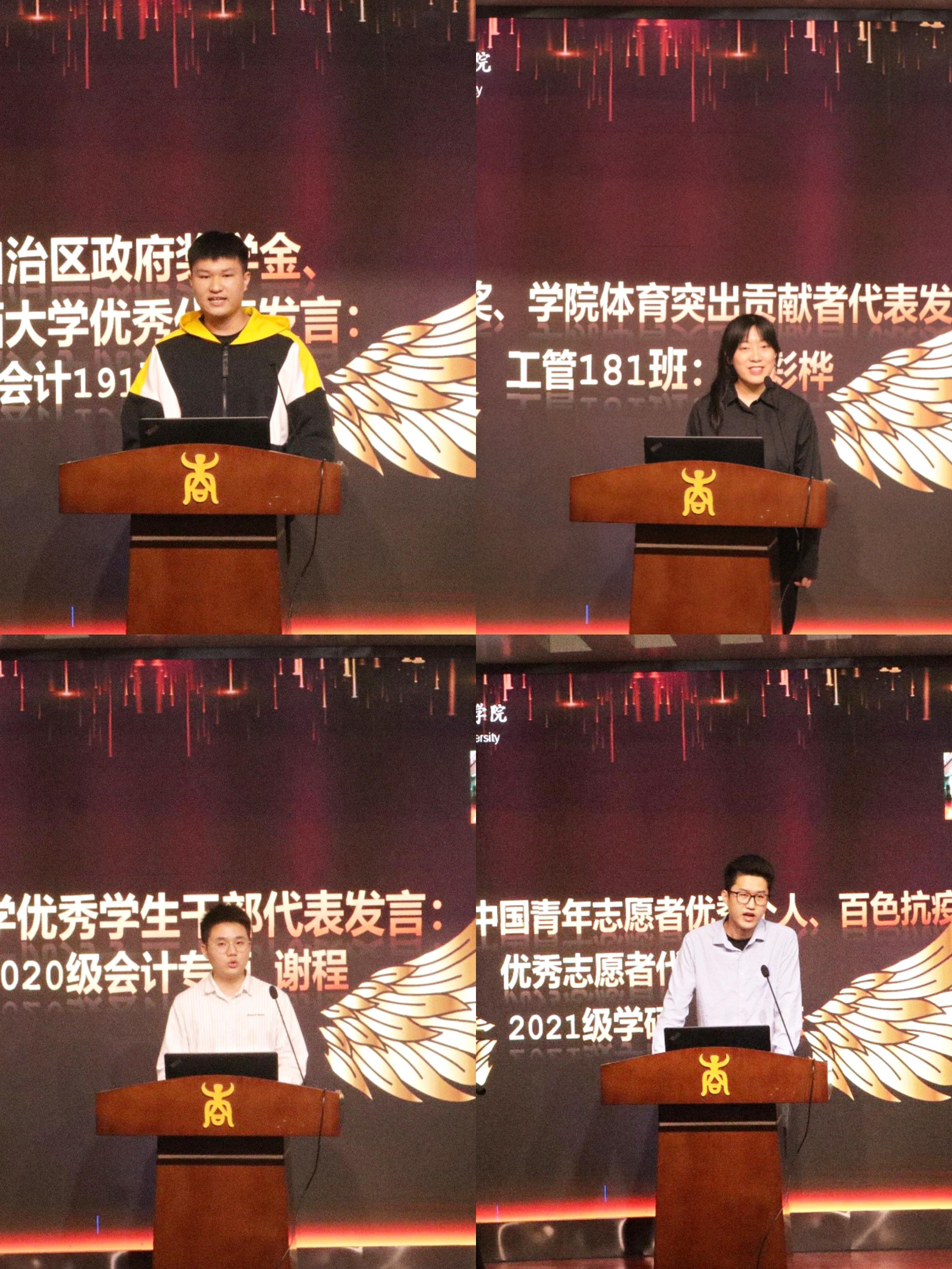 自治区政府奖学金、bwin必赢国际中国官方网站优秀学生代表黄泓创,学院体育杰出贡献者、高顿考研优秀奖学生代表李彩桦,bwin必赢国际中国官方网站优秀学生干部代表谢程,第十三届中国青年志愿者优秀个人、百色抗疫优秀志愿者代表陈允杰等四位同学分别上台发表获奖感言。他们对学院领导和老师表达了衷心的感谢,回顾了自己在大学期间参加各类学科竞赛、考研、学生工作、百色抗疫等经历,分享心得体会,总结成功经验,体现了对学习、生活和集体的热爱。