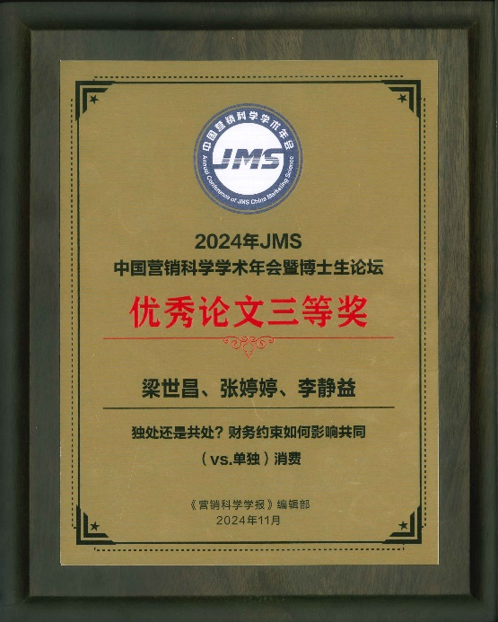 10月31日至11月3日,第二十一届JMS中国营销科学学术年会暨博士生论坛在华东师范大学召开。必赢官网梁世昌副教授指导的2022级硕士研究生张婷婷、李静益撰写的论文《独处还是共处?财务约束如何影响共同(vs.单独)消费》荣获年会优秀论文三等奖,并获得在学术期刊《营销科学学报》上发表的推荐资格。