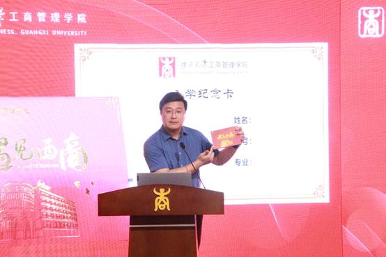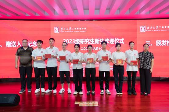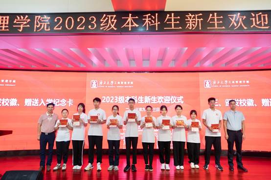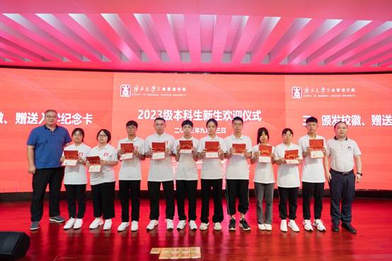 随后,学院领导、老师们向2023级新生代表现场赠予bwin必赢国际中国官方网站校徽以及入学纪念卡。为表达对新生们的热烈欢迎,学院特别为每一位新生都订制了精美的“遇见西商”入学纪念卡。每张纪念卡上记录着新生的姓名、专业、学号,以及一张入学时的相片,为新生留下深刻美好的入学回忆。在全体新生的见证下,院领导为新生代表赠送校徽、入学纪念卡,意味着他们已成为光荣的“西商人”,是他们永不褪色的标签,传递了老师们对新生的殷切希望、憧憬与希冀。