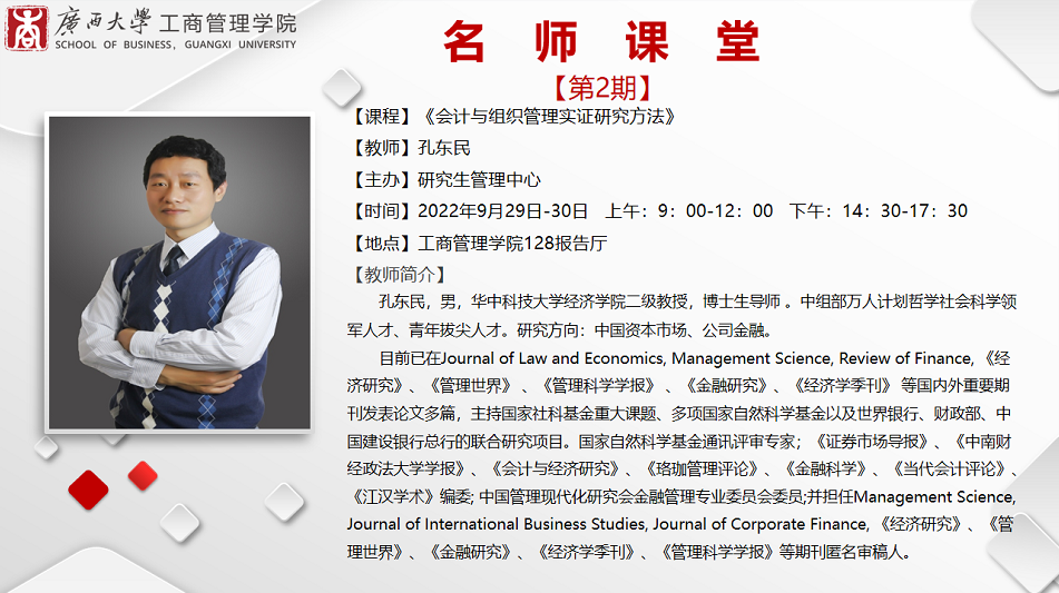2022年9月29日到30日,必赢官网邀请华中科技大学经济学院二级教授、博士生导师孔东明到校讲授《会计与组织管理实证研究方法》。孔教授以“实证研究中的因果识别”为主题,在bwin必赢国际中国官方网站128报告厅为必赢官网师生带来了一场别开生面的实证研究方法课堂。