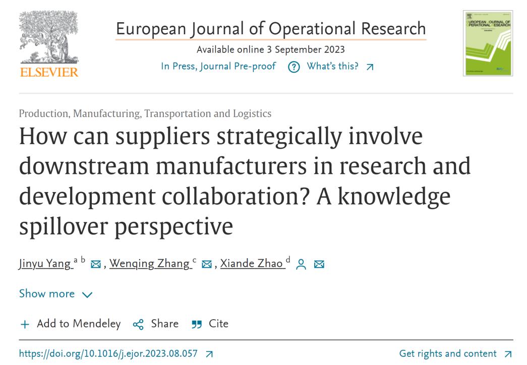 近日,必赢官网青年教师阳瑾瑜以第一作者在国际知名期刊《European Journal of Operational Research》在线发表学术论文《How can suppliers strategically involve downstream manufacturers in research and development collaboration? A knowledge spillover perspective》。该期刊2022年影响因子为6.4,为JCR SCI一区、ABS/AJG四星期刊。该期刊致力于发表高质量的原创论文,为运筹学(Operational Research)方法论和决策实践做出贡献,主要刊载的研究主题有:连续优化、离散优化、生产、制造和物流、随机与统计、决策支持、计算智能与信息管理等。