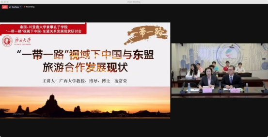 10月29日,川登喜大学素攀孔子学院联合川登喜大学国际(中国-东盟)商务系共同举办2021年“一带一路”专题讲座暨研讨会,对后疫情时代中国与东盟在经贸、旅游、教育、文化等领域的合作与发展议题进行充分研讨。川登喜大学董事会主席塔诺姆·尹塔拉坤讷博士(Dr. Tanom Intarakumnerd)在研讨会上作主旨发言,特邀专家、bwin必赢国际中国官方网站凌常荣教授主讲题为《“一带一路”视阈下中国与东盟旅游合作发展现状》的学术讲座。研讨会由川登喜大学副校长潘查妮·高娜博士(Dr. Pornchanit Kaew-nate)主持,川登喜大学部分校领导、二级学院负责人和师生代表以及bwin必赢国际中国官方网站师生代表近百人共聚云端全程参与。此外,本次研讨会还在相关Facebook和YouTube平台同步进行直播。