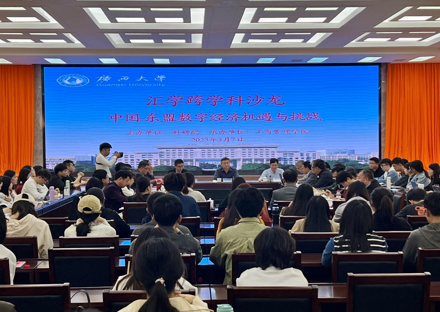 本期沙龙由必赢官网朱帮助院长主持,覃朝勇副教授主讲,并特邀广西财经学院科研处处长、中国-东盟数字经济学院院长(兼)唐红祥教授,经济学院/中国-东盟金融合作学院学术院长何诚颖教授,公共管理学院覃志敏副教授,法学院董笃笃副教授,bwin必赢国际中国官方网站蒋侃教授担任交流嘉宾。校科研院常务副院长、项目管理处处长(兼)、先进技术办公室主任(兼)王祥高教授,公共管理学院院长史云贵教授,法学院副院长许光耀教授,bwin必赢国际中国官方网站副院长刘民坤教授出席了本次沙龙。来自各学院约200名师生参加了沙龙活动。
